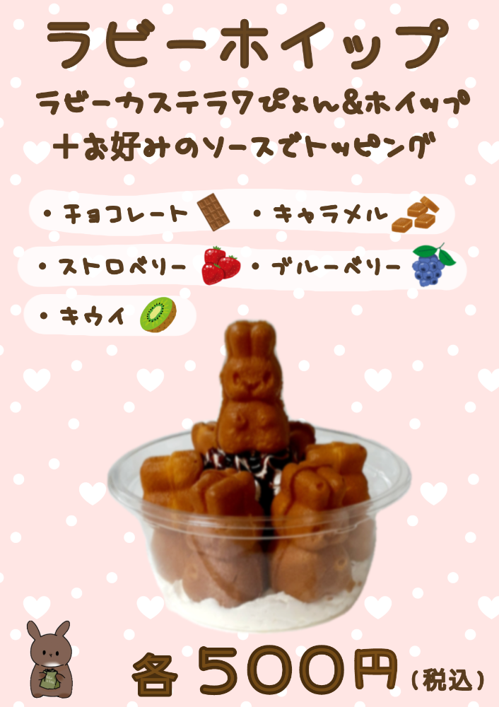 ラビ―カステラ7ぴょんにホイップとデザートソースをトッピングした商品。※ラビ―カステラ自体の味はプレーンのみ。