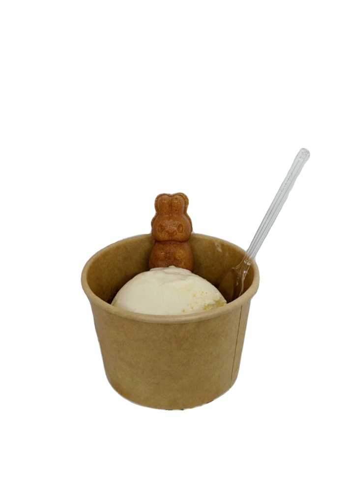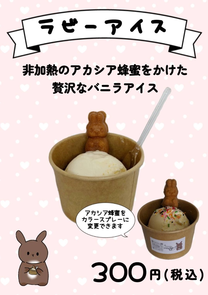 カップアイスにアカシア蜂蜜を垂らし、おまけにラビ―カステラを1ぴょん乗せたもの。